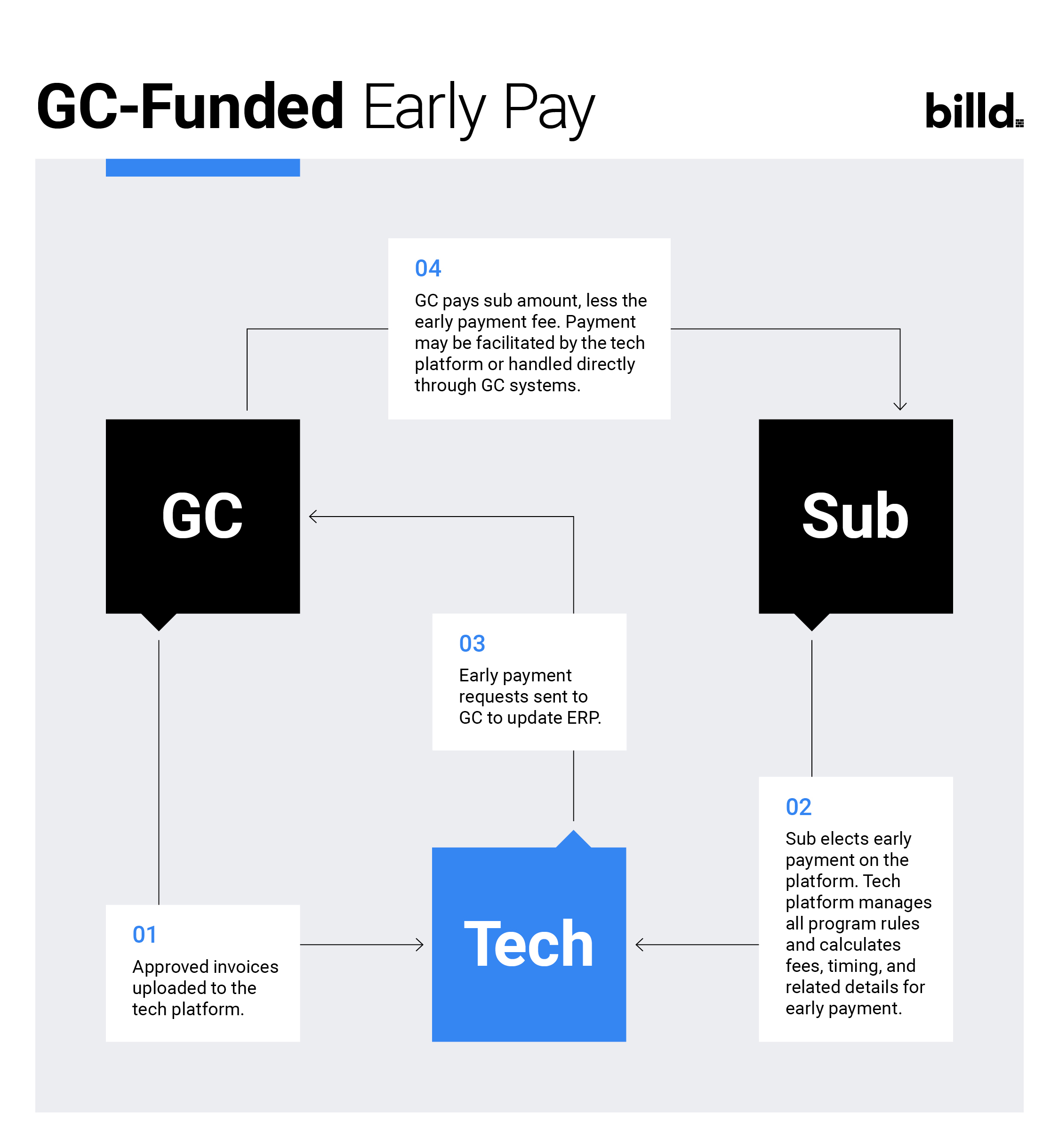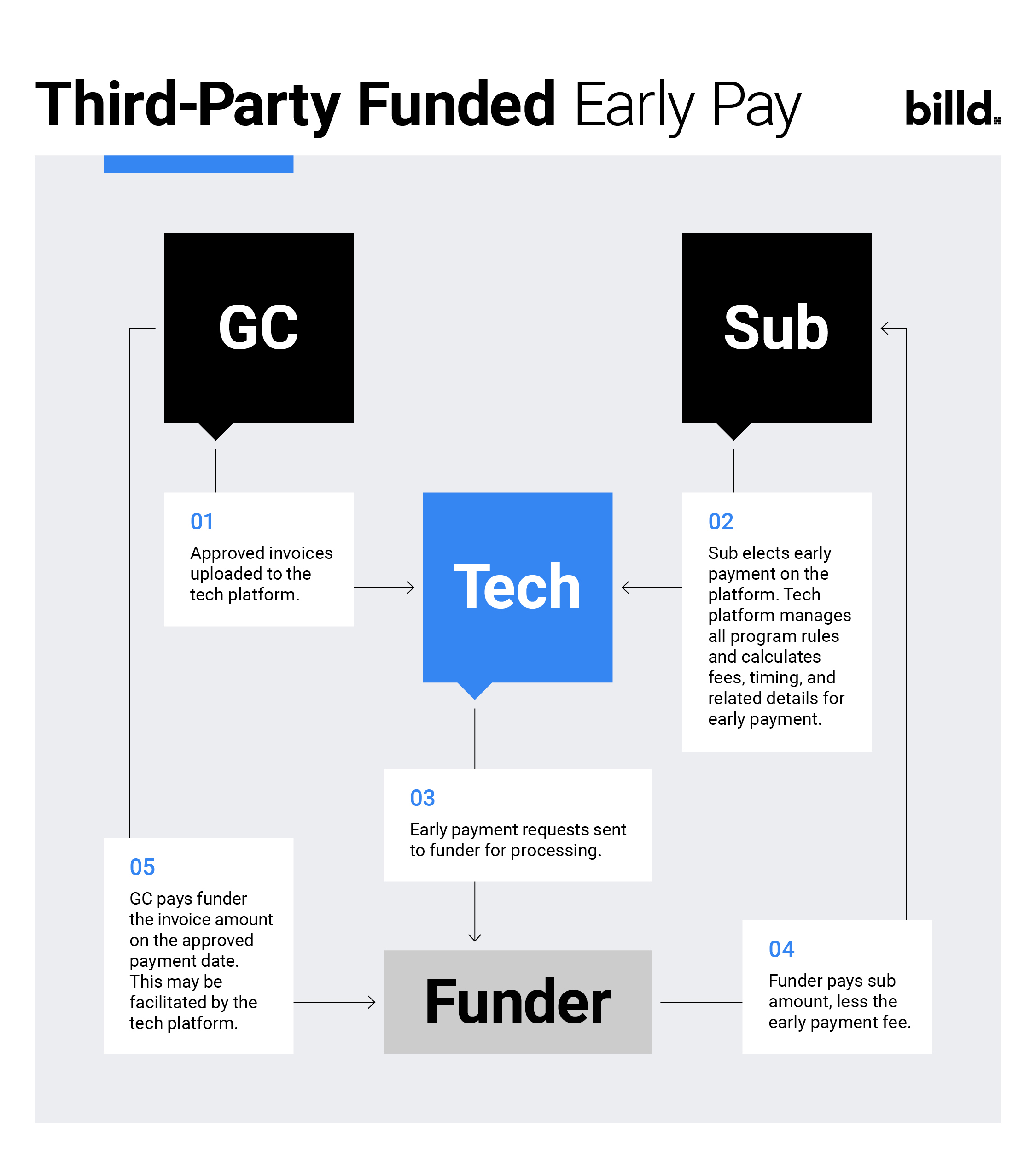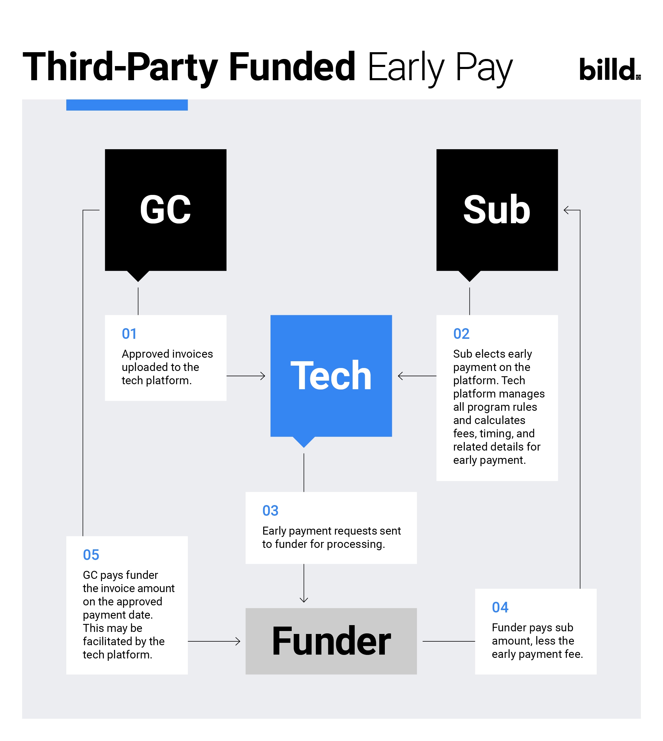 Early pay programs generally fall into two structural models based on who provides the capital for early payment: a GC-funded model or a third-party funded model.