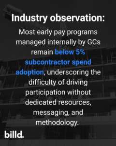 This ties directly back to the early pay program’s objectives. If the objective is modest, such as offering occasional early payments where incremental returns are sufficient, a self-managed approach may work. However, if the goal is meaningful subcontractor adoption and a scalable financial outcome, general contractors must consider whether they have the time, personnel, and expertise required to operate the program.
