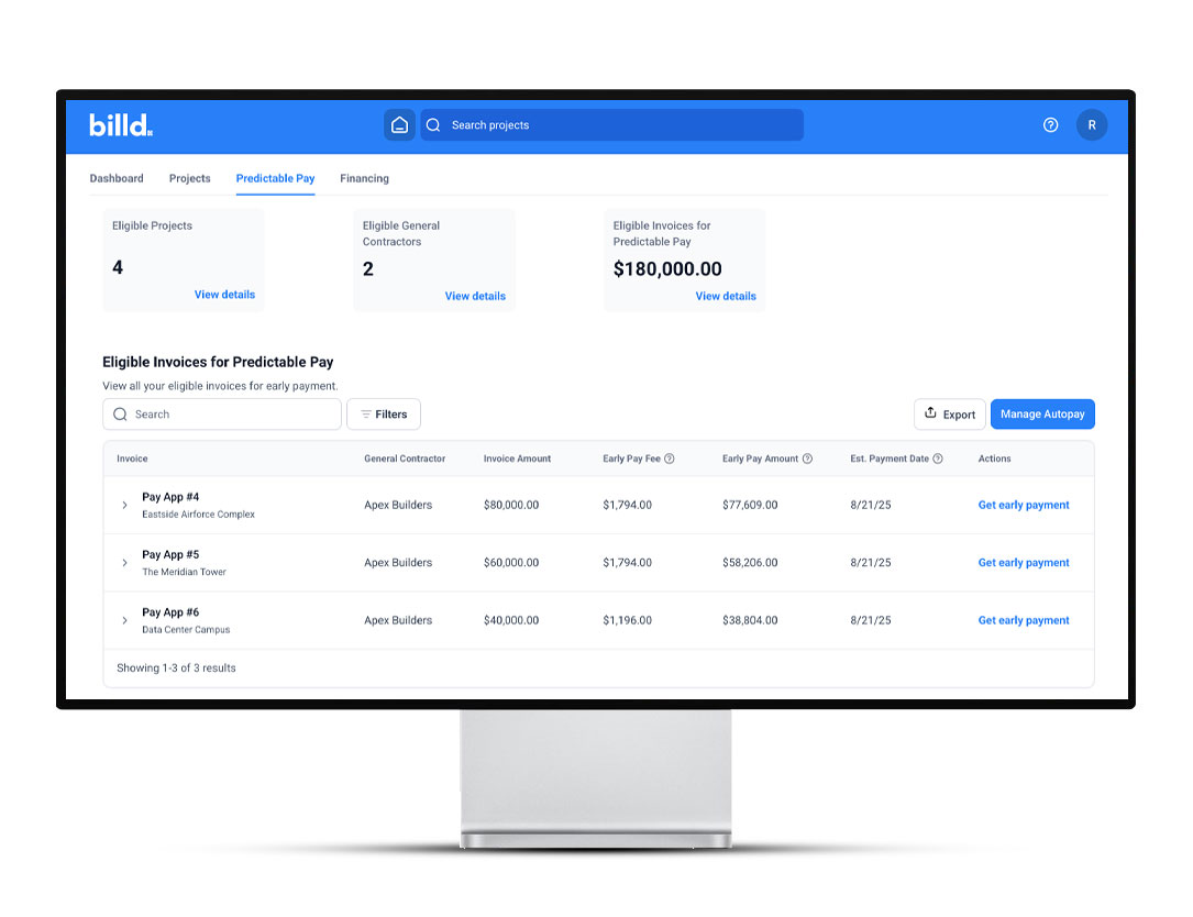 Predictable Pay is an early pay program powered by Billd that gives subcontractors access to faster payments on approved invoices—as quickly as the next business day. The program is designed to accelerate payment to subcontractors ahead of the standard payment timeline. Depending on the funding model chosen, the GC may pay subcontractors directly and early (self-funded), have a third-party funder pay subcontractors early while the GC pays that funder at invoice maturity (third-party funded), or use a combination of both (hybrid).