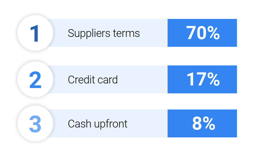 When asked to select their most common method for purchasing materials, contractors showed considerable reliance on supplier terms. 89% have terms with suppliers. 70% of contractors polled preferred supplier terms over credit cards, cash or bank loans. However, additional data shows that those terms are not long enough to support construction payment cycles.