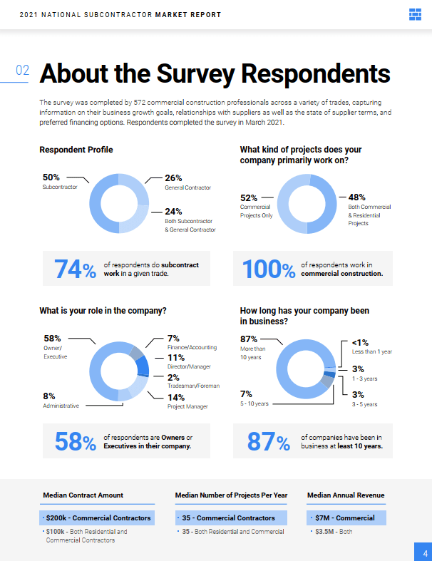 The survey was completed by 572 commercial construction professionals across a variety of trades, capturing information on their business growth goals, relationships with suppliers as well as the state of supplier terms, and preferred financing options. Respondents completed the survey in March 2021.