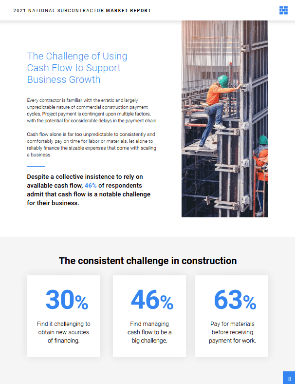 Without a landscape of supportive, flexible financing options, it will become increasingly difficult to do business at all in our industry. Subcontractors are business owners for whom access to capital isn’t “nice to have,” it’s a necessity. That’s what makes this report, the problems it explores, and the solutions the industry will react with, all the more timely.