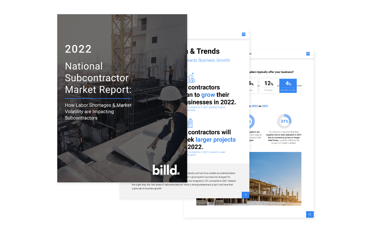 The fact of the matter is, subcontractors need advocates. They need financiers and suppliers and GC’s who truly align their success with the sub’s. They need partners who will help them weather a volatile market and unpredictable price changes. The old industry model has to evolve. If it doesn’t, those shrinking profit margins and insufficient supplier terms could lead to fewer subcontractors on the market. That means better terms, better management of material and labor price hikes, adoption of new technology, and greater project efficiency will be key in 2022. I’m proud to say that Billd is doing our part — offering subcontractors crucial tools to alleviate the cash flow crunch subcontractors so often encounter. As champions of the sub, we see you, we hear you, and we’re ready to help you excel in 2022.