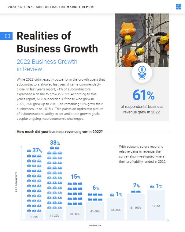 Despite the industry challenges they face, subcontractors are still determined to make the best of 2023. Respondents showed interest in growing their businesses, in line with how they’ve responded year after year. More subcontractors appear interested in going after larger projects, provided they have sufficient profit margins.
