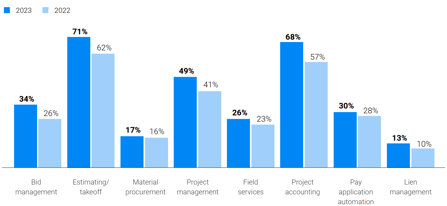 We’ve seen an uptick in technology adoption across the industry for well over a decade. The survey showed that more and more companies are turning to the widely available technologies that serve construction. Estimating and takeoff software are now used by 71% of respondents, compared with 62% just one year ago. Bid management and project accounting also saw significant year over year gains, pushing construction toward a more modern future.